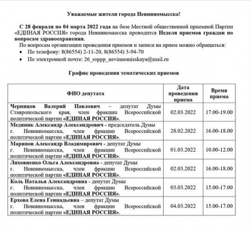 С 28 февраля по 04 марта 2022 года на базе Местной общественной приемной Партии «ЕДИНАЯ РОССИЯ» города Невинномысска проводится Неделя приемов граждан по вопросам здравоохранения.