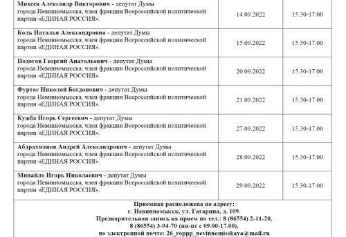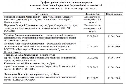 В сентябре 2022 года на базе Местной общественной приемной Партии «ЕДИНАЯ РОССИЯ» города Невинномысска проводится прием граждан