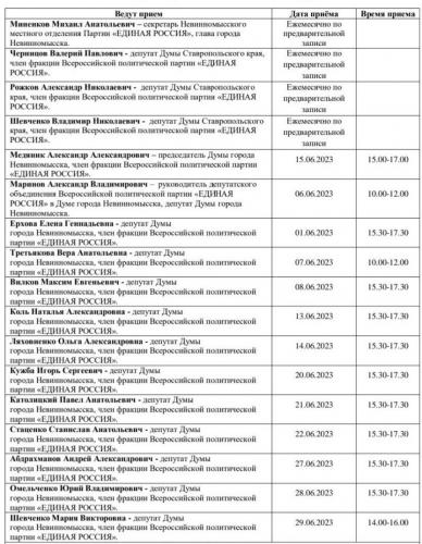 График приема граждан по личным вопросам в местной общественной приемной Всероссийской политической партии «ЕДИНАЯ РОССИЯ» на июнь 2023 года