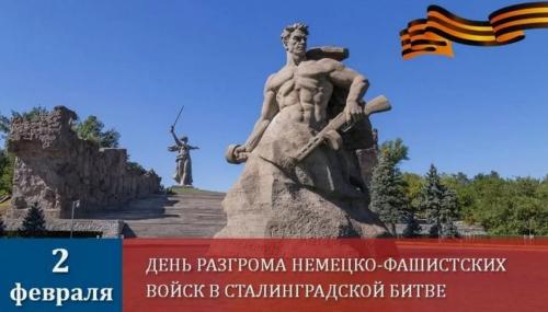 НовостиДень разгрома советскими войсками немецко-фашистских войск в Сталинградской битве в1943г.02.02.2024 2 февраля отмечается День воинской славы России — День разгрома советскими войсками немецко-фашистских войск в Сталинградской битве в1943г. Сталинградская битва — одна из крупнейших в Великой Отечественной войне 1941-1945 годов. Немецко-фашистское командование планировало летом 1942 года разгромить советские войска на юге страны, овладеть нефтяными районами Кавказа, богатыми сельскохозяйственными районами Дона и Кубани, нарушить коммуникации, связывающие центр страны с Кавказом, и создать условия для окончания войны в свою пользу. Выполнение этой задачи возлагалось на группы армий "А" и "Б". Для наступления на сталинградском направлении из состава немецкой группы армий "Б" была выделена 6-я армия под командованием генерал-полковника Фридриха Паулюса и 4-я танковая армия. К 17 июля 6-я немецкая армия имела в своем составе около 270 тысяч человек, три тысячи орудий и минометов, около 500 танков. Ее поддерживал 4-й воздушный флот (до 1200 боевых самолетов). Немецко-фашистским войскам противостоял Сталинградский фронт, имевший 160 тысяч человек, 2,2 тысячи орудий и минометов, около 400 танков. Его поддерживали 454 самолета 8-й воздушной армии, 150-200 бомбардировщиков авиации дальнего действия Оборонительная операция длилась с 17 июля по 18 ноября 1942 года, целью которой была оборона города Сталинграда. Наступление наших войск началось 19 ноября 1942 года, завершившееся 2 февраля 1943 года разгромом действовавшей на сталинградском направлении группировки немецко-фашистских войск. Во время Сталинградской наступательной операции были разгромлены немецкие 6-я армия и 4-я танковая армия, 3-я и 4-я румынские армии, 8-я итальянская армия. Общие потери противника составили около 1,5 миллиона человек. В Германии впервые за годы войны был объявлен национальный траур. Сталинградская битва внесла решающий вклад в достижение коренного перелома в Великой Отечественной войне. Советские вооруженные силы захватили стратегическую инициативу и удерживали ее до конца войны. Поражение фашистского блока под Сталинградом подорвало доверие к Германии со стороны ее союзников, способствовало активизации движения Сопротивления в странах Европы. Япония и Турция вынуждены были отказаться от планов активных действий против СССР. Победа под Сталинградом явилась результатом несгибаемой стойкости, мужества и массового героизма советских войск. За боевые отличия, проявленные в ходе Сталинградской битвы, 44 соединениям и частям были присвоены почетные наименования, 55 — награждены орденами, 183 — преобразованы в гвардейские. Десятки тысяч солдат и офицеров были удостоены правительственных наград. 112 наиболее отличившихся воинов стали Героями Советского Союза. В честь героической обороны города советское правительство учредило 22 декабря 1942 года медаль "За оборону Сталинграда", которой были награждены более 700 тысяч участников битвы. 1 мая 1945 года в приказе Верховного главнокомандующего Сталинград был назван городом-героем. 8 мая 1965 года в ознаменование 20-летия победы советского народа в Великой Отечественной войне город-герой был награжден орденом Ленина и медалью "Золотая Звезда". В городе свыше 200 исторических мест, связанных с его героическим прошлым. Среди них мемориальный анса