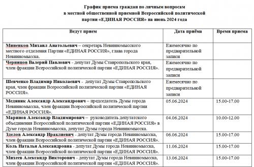 График приема граждан по личным вопросам партии «ЕДИНАЯ РОССИЯ» на июнь 2024 года