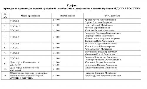 График проведения Единого дня приёма граждан 1 декабря 2015 г. депутатами - членами фракции «ЕДИНАЯ РОССИЯ»