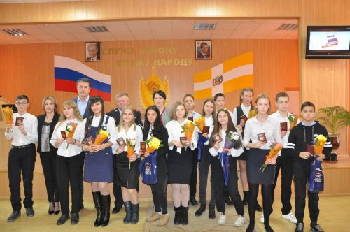 НовостиЮным невинномысцам вручили паспорта11.12.2019 В канун Дня Конституции Российской Федерации в рамках патриотической акции «Мы – граждане России!» юным невинномысцам, достигшим 14-летнего возраста, были вручены паспорта граждан Российской Федерации. Четырнадцать школьников, отличившиеся хорошей учебой, спортивными и творческими достижениями, общественной деятельностью, в торжественной обстановке получили свой главный документ– паспорт гражданина РФ. Поздравили учащихся и вручили юным гражданам Невинномысска паспорта первый заместитель председателя Думы города Сергей Пластун, первый заместитель главы администрации города Виктория Соколюк, начальник отдела МВД по городу Невинномысску Александр Толмачев и начальник отдела по вопросам миграции МВД России по городу Невинномысску Юлия Коркмазова. В своем выступлении первый заместитель председателя Думы города Сергей Пластун пожелал учащимся быть достойными гражданами нашей страны, а также успешной учебы и новых достижений. (Соб.инф.) Последние новости10.03.2026 День архивов08.03.2026 Уважаемые жительницы нашего города! 08.03.2026 В «СКК «Олимп» 7 марта состоялось торжественное открытие IV традиционного турнира по самбо 08.03.2026 В преддверии Международного женского дня 8 Марта депутаты выразили искренние поздравления и глубокое уважение женщинам, внесшим неоценимый вклад в нашу историю. 07.03.2026 «Милые! Родные! Ненаглядные!» 05.03.2026 4 марта 2026 года, депутатом Думы города Невинномысска Верой Третьяковой был проведен личный приём граждан. 02.03.2026 Особые дети вместе с родителями из первого благотворительного общества провели выходные в спортивном клубе «Надежда» в Архызе. 28.02.2026 Партийный десант - дополнительная мера контроля. 27.02.2026 «Мама, папа, я – дружная семья»! 27.02.2026 Депутат Думы города по одномандатному избирательному округу №16 Шевченко Мария Викторовна провела приём избирателей |